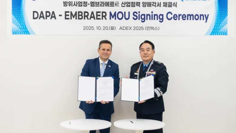 Seoul, South Korea, 20 October 2025 – Embraer and South Korea’s Defense Acquisition Program Administration (DAPA)[1] have signed a Memorandum of Understanding that will see both parties cooperating on new businesses and market development opportunities in the defense sector of South Korea.