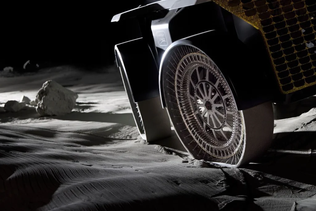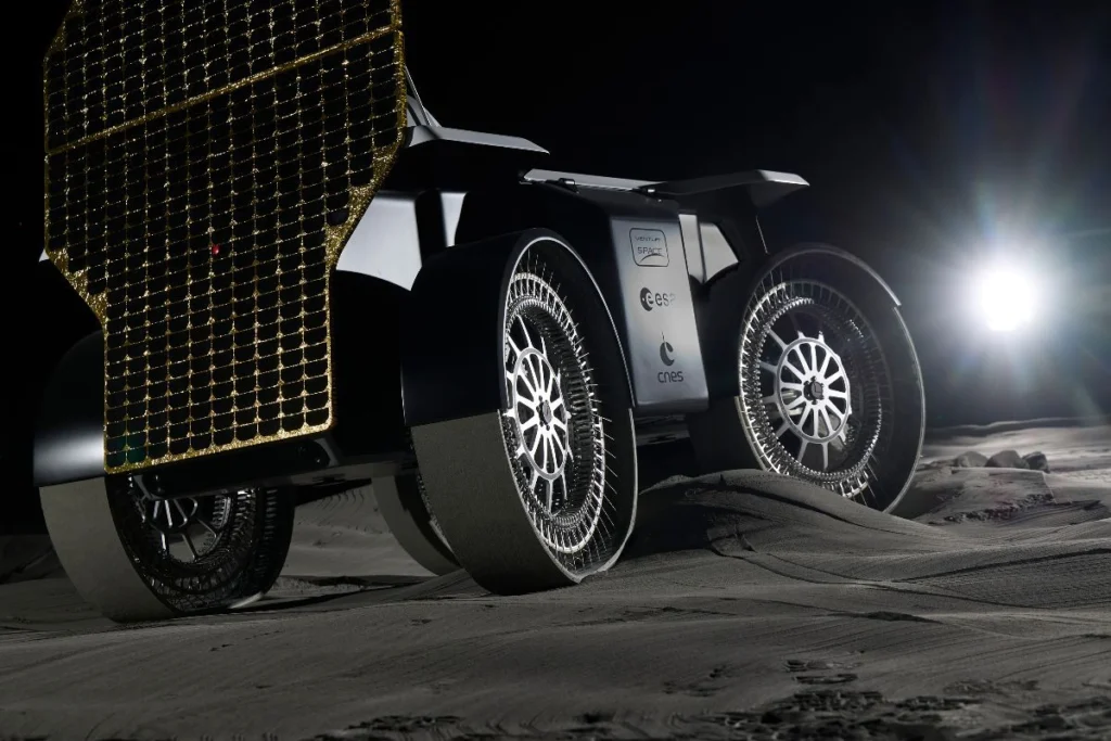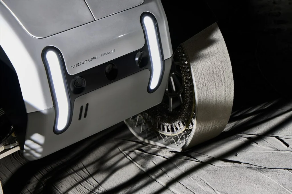 Designed to support the ambitions of the European Space Agency (ESA) and France’s Centre National d’Études Spatiales (CNES), MONA LUNA already incorporates technologies that will operate on the Moon next summer — but on board another rover: FLIP. This vehicle will be equipped with the same hyper‑deformable wheels, batteries, heating systems and temperature sensors as the European rover. FLIP is developed by the North American company Venturi Astrolab, Venturi Space’s strategic partner. FLIP will also benefit from another innovative technology developed by Venturi Space: the mechanical system enabling the rover to exit the lunar lander. Another shared feature between MONA LUNA and FLIP is their bodywork, designed by Sacha Lakic.
