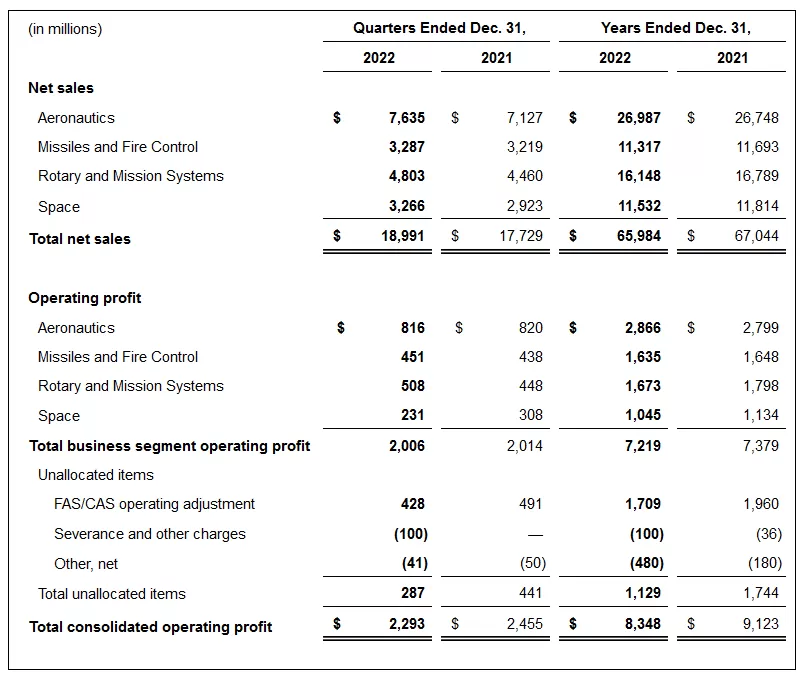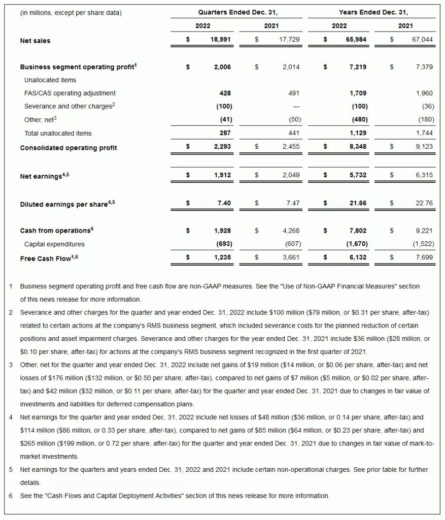 BETHESDA, Md., Jan. 24, 2023 /PRNewswire/ — Lockheed Martin Corporation [NYSE: LMT] today reported fourth quarter 2022 net sales of $19.0 billion, compared to $17.7 billion in the fourth quarter of 2021. Net earnings in the fourth quarter of 2022 were $1.9 billion, or $7.40 per share, compared to $2.0 billion, or $7.47 per share, in the fourth quarter of 2021. Net earnings for the fourth quarter of 2022 include certain non-operational items of $129 million, or $0.39 per share, compared to $(92) million, or $(0.25) per share in the fourth quarter of 2021. See table below for further details. Cash from operations was $1.9 billion in the fourth quarter of 2022, compared to $4.3 billion in the fourth quarter of 2021. Free cash flow was $1.2 billion in the fourth quarter of 2022, compared to $3.7 billion in the fourth quarter of 2021.
