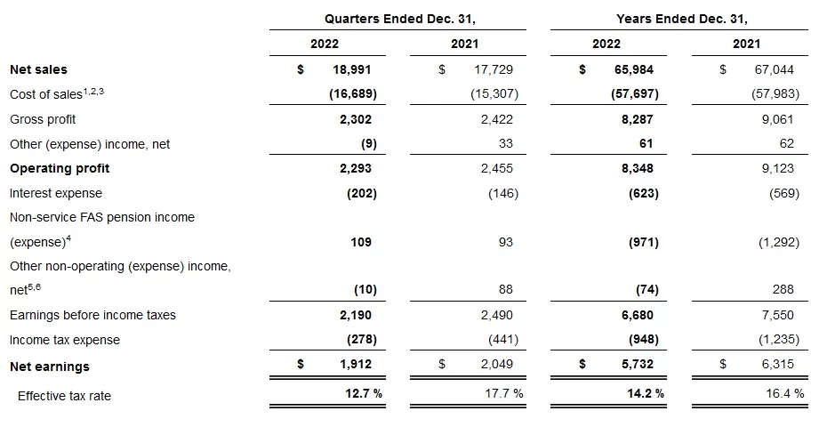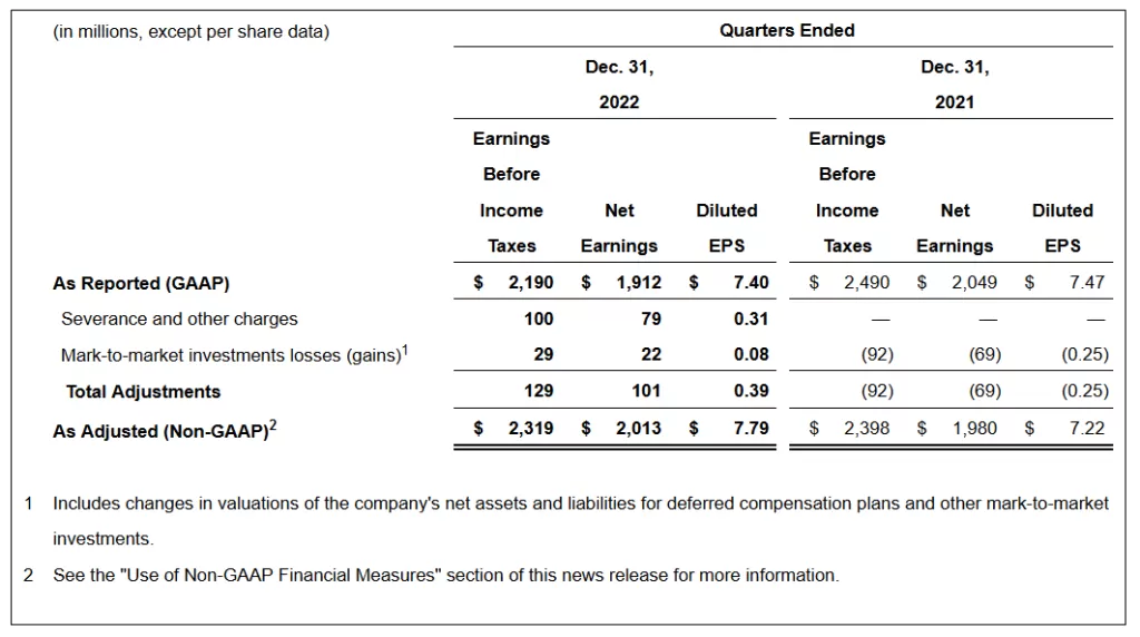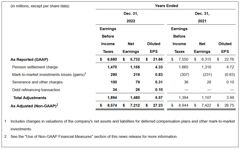 | 2 | In the quarter and year ended Dec. 31, 2022, the company recognized net gains of $19 million ($14 million, or $0.06 per share, after-tax) and net losses of $176 million ($132 million, or $0.50 per share, after-tax), compared to net gains of $7 million ($5 million, or $0.02 per share, after-tax) and $42 million ($32 million, or $0.11 per share, after-tax) in the quarter and year ended Dec. 31, 2021 due to changes in fair value of investments and liabilities for deferred compensation plans. |