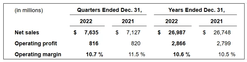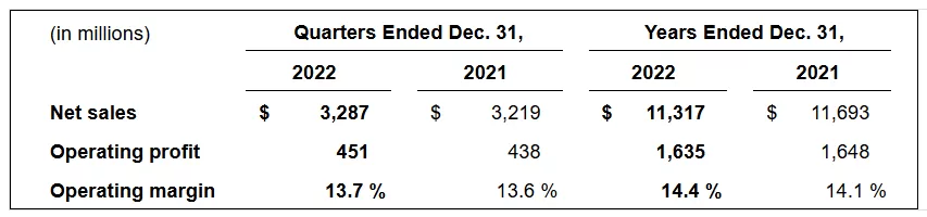The company’s consolidated net favorable profit booking rate adjustments represented approximately 25% of total segment operating profit in both the quarter and year ended Dec. 31, 2022, as compared to 29% and 28% in the quarter and year ended Dec. 31, 2021.
