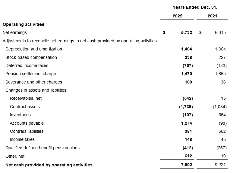 Cash from operations in the fourth quarter of 2022 was $1.9 billion. Capital expenditures were $693 million, resulting in free cash flow of $1.2 billion. The decrease in operating and free cash flows in the fourth quarter of 2022 was primarily due to timing of production and billing cycles impacting contract assets (primarily F-35).