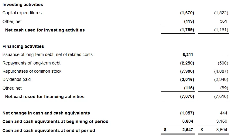 Free cash flow is cash from operations less capital expenditures. The company’s capital expenditures are comprised of equipment and facilities infrastructure and information technology (inclusive of costs for the development or purchase of internal-use software that are capitalized). The company uses free cash flow to evaluate its business performance and overall liquidity and it is a performance goal in the company’s annual and long-term incentive plans. The company believes free cash flow is a useful measure for investors because it represents the amount of cash generated from operations after reinvesting in the business and that may be available to return to stockholders and creditors (through dividends, stock repurchases and debt repayments) or available to fund acquisitions or other investments. The entire free cash flow amount is not necessarily available for discretionary expenditures, however, because it does not account for certain mandatory expenditures, such as the repayment of maturing debt and pension contributions.