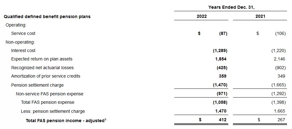 Total FAS/CAS pension adjustment and Total FAS pension income have been adjusted for the noncash, non-operating pension settlement charges recorded in the second quarter 2022 and third quarter 2021. Management believes that the exclusion of the pension settlement charge is useful to understanding the company’s underlying business performance and comparing performance from period to period.
