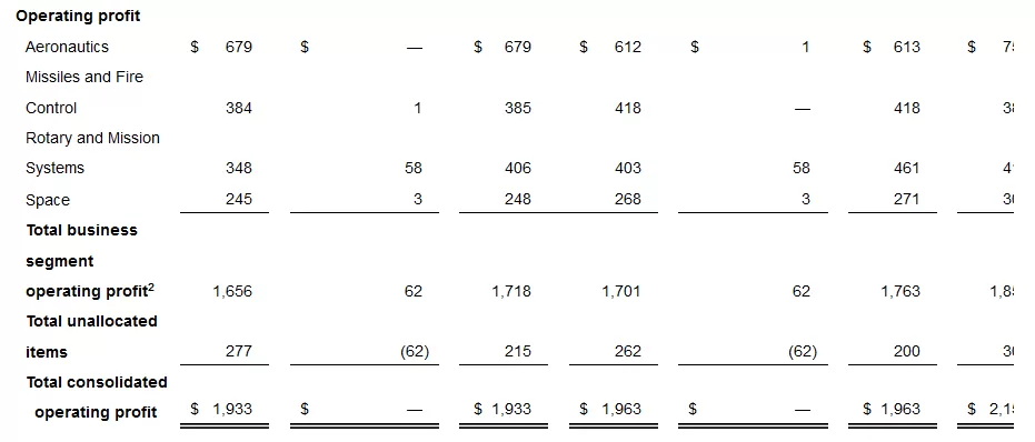 Business segment operating profit excludes the FAS/CAS pension operating adjustment, a portion of corporate costs not considered allowable or allocable to contracts with the U.S. Government under the applicable U.S. Government cost accounting standards (CAS) or federal acquisition regulations (FAR), and other items not considered part of management’s evaluation of segment operating performance such as a portion of management and administration costs, legal fees and settlements, environmental costs, stock-based compensation expense, retiree benefits, significant severance actions, significant asset impairments, gains or losses from divestitures, and other miscellaneous corporate activities. Excluded items are included in the reconciling item “Unallocated items” between operating profit from our business segments and our consolidated operating profit.