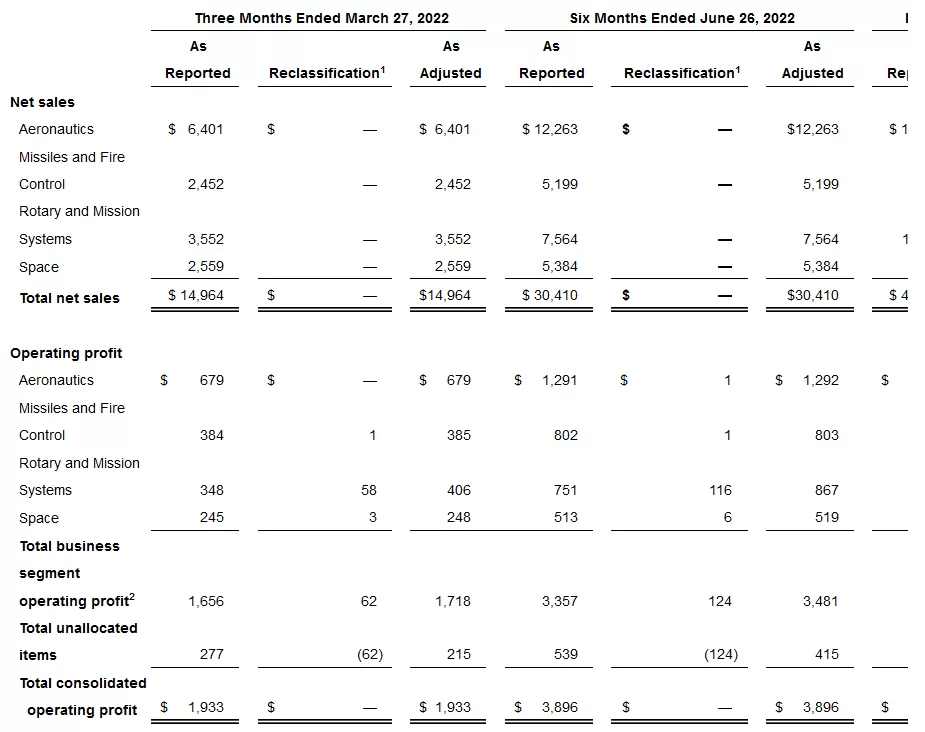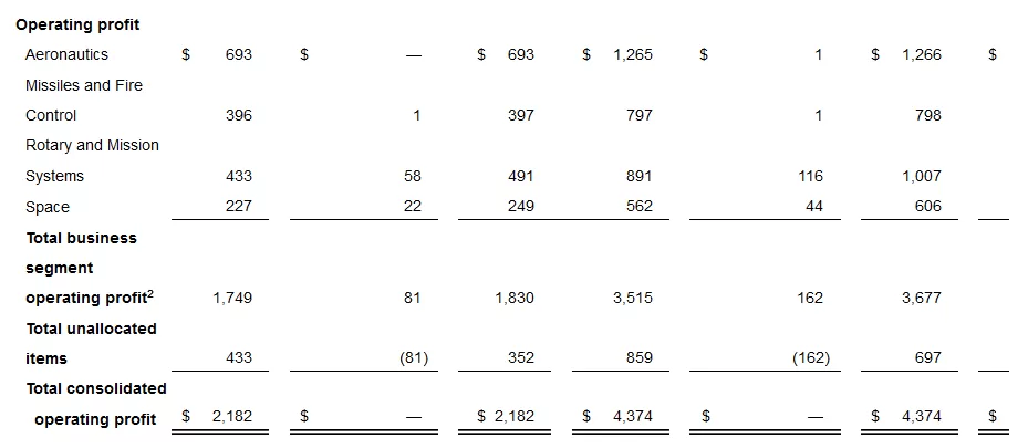 The company operates in four business segments organized based on the nature of products and services offered: Aeronautics, Missiles and Fire Control (MFC), Rotary and Mission Systems (RMS) and Space. The following table presents summary operating results of the company’s business segments and reconciles these amounts to the company’s consolidated financial results.